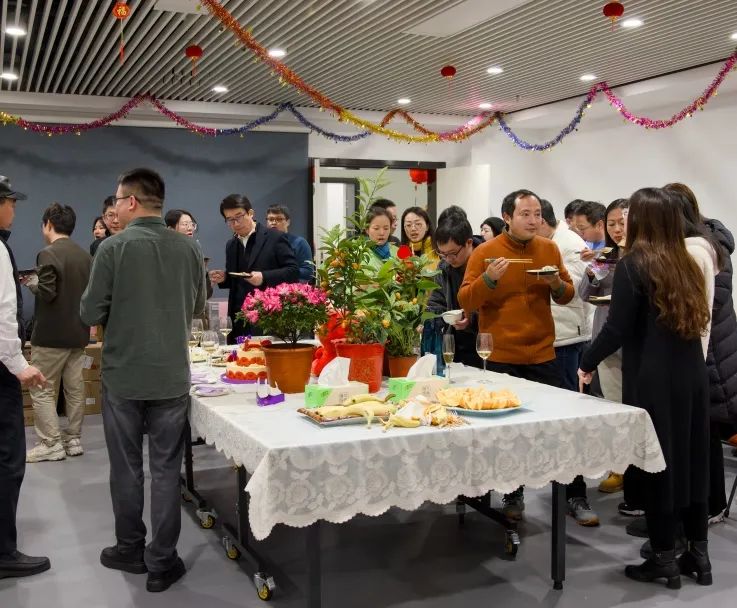 致辞过后,丰富的美食盛宴就开始了。这次联欢活动学院准备了南京烤鸭、羊肉串、羊肉汤、双层大蛋糕、饺子,还有水果、茶饮等各种美食和饮品。老师们品尝美食,举杯同庆过去一年的成绩,展望畅谈未来的发展