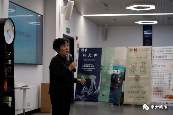 接下来,指导教师代表白净老师发言,她说,院媒是一个老师和学生面对面交流的地方,南大新传有一套完整的机制支持着校园媒体的运行,让校园实践平台走得更远。社会化媒体时代每个人都要学会“媒体能力”,而每个院媒都有自己的侧重,每位同学可以根据自己的兴趣和需要的技能选择加入不同的院媒,全方位提升自己的实践能力。