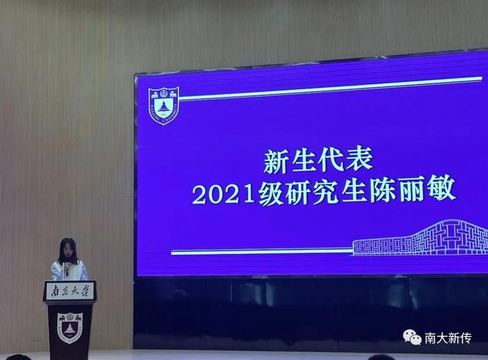 21级学硕陈丽敏作为新生代表进行了发言。相比于一些同学来说,她是一名老生,因为她已经在这里度过了本科时光,但她更是一名新生,对研究生的学习生活既紧张、又期待。她说,南大新传容得下真相和真理,更容得下情怀与理想,期待未来能与大家携手并进,探索无边无际的学术海洋、捍卫新闻传播的事业与价值,在更大的舞台上发出我们的声音。