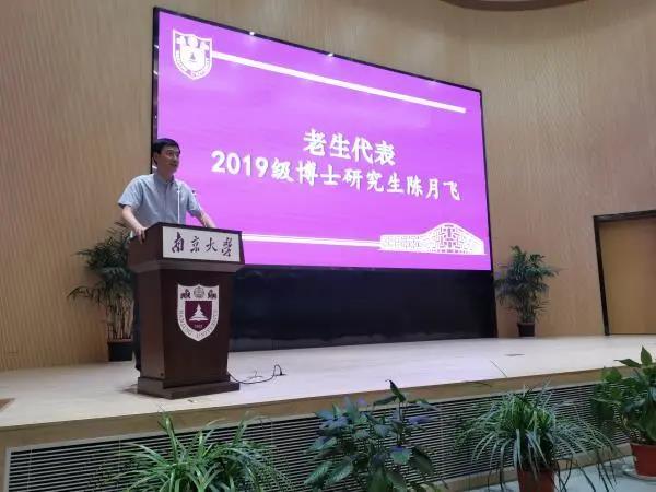 疫情期间,陈月飞曾奔赴湖北抗疫一线采访,他回顾了在新冠肺炎中,奔赴抗疫一线的南大新闻人的故事——“平淡的生活和日复一日的工作,会让你忘记当初为什么要出发”,但到了那时,潜意识会告诉你:“去吧”。他坚信在座和未来的同行们的选择,一定会做出和自己一样的回答。他代表奔赴一线的新闻人,向南大新传的老师表示感谢,感谢老师们的教导,让他们有勇气赶赴正确的位置,有勇气和底气去完成自己的义务。在一线用镜头和笔记录故事,他们看到了很多感人的瞬间。陈同学说,这次湖北之行也让他看到了职业素养、职业精神、看到现实模样。最后,他提到一句经常在疫情中出现的话:“把失去的时间抢回来”,勉励新生同学们。陈同学希望与大家共勉,一起加强学习,把时间抢回来。