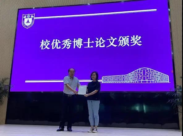孙文峥在导师郑欣教授的指导下,获得了学校优秀博士论文的光荣称号,该奖项全校仅 62 位,代表了校研究生的最高学术水准。院党委刘源书记为孙文峥老师颁发了证书。