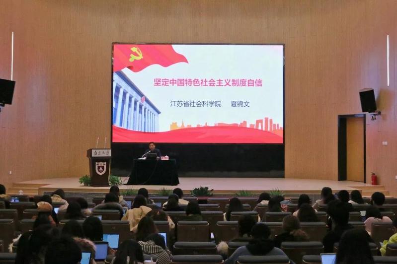 联合主办的国情教育课在仙林校区紫金楼报告厅举行第八讲。江苏省社科院党委书记、院长夏锦文结合党的十九届四中全会精神,以“坚定中国特色社会主义制度自信”为题进行了授课。成人网