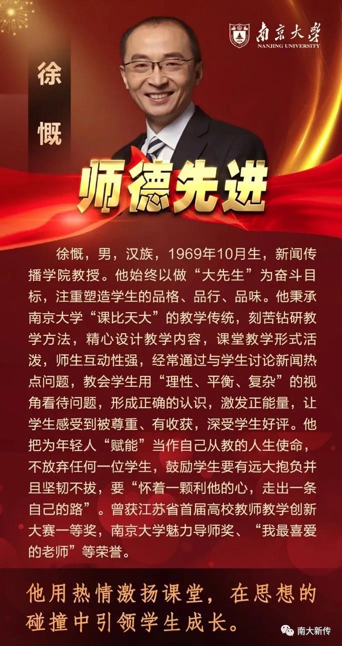 学为人师,行为世范。徐慨教授经常以自己作为成人网 第一届毕业生、长期从事新闻传媒工作的经历为例,鼓励年轻学子要有远大抱负并且坚韧不拔,要“怀着一颗利他的心,走出一条自己的路”,培养了众多优秀的新闻传播学子,体现了南大师者之风!