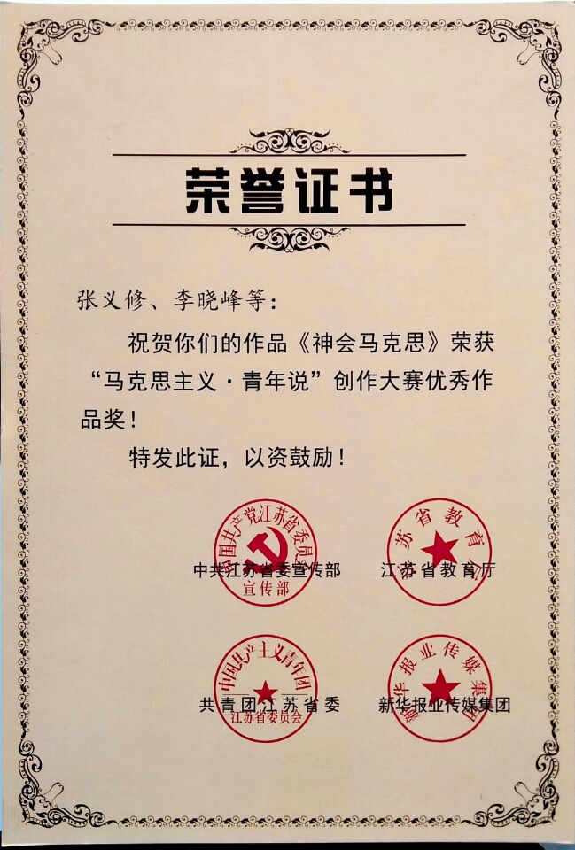 成人网 李晓峰老师参与指导的36集系列微视频《神会马克思》,获”马克思主义·青年说“创作大赛优秀作品奖,该奖项由中共江苏省委宣传部、江苏省教育厅、共青团江苏省委、新华报业传媒集团联合颁发。
