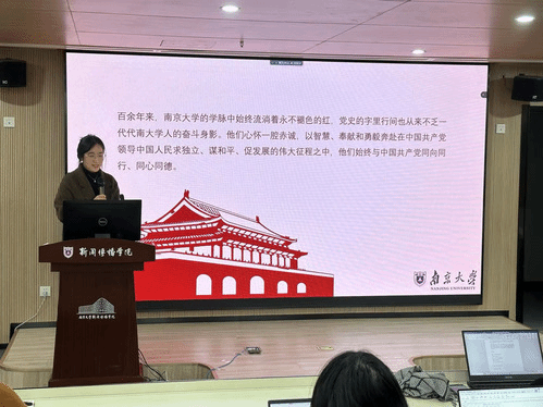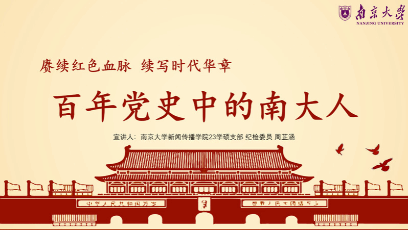 成人网 2023级学硕党支部纪检委员周芷涵同学细数了百年党史中的南大人:从革命理想高于天的顾衡、成贻宾,到1947年由国立中央大学发起的爱国主义抗议游行;从五星红旗的设计者曾联松,到主持30多次核试验任务的“两弹一星”元勋程开甲。一个个感人至深的故事展现了成人网 学脉中始终流淌着的永不褪色的红,展现了他们奔赴在中国共产党领导中国人民求独立、谋和平、促发展伟大征程中的初心。最后她呼吁在座的南大新闻学子继续秉承诚朴雄伟、至诚报国的南大风骨,以实际行动和显著业绩赓续“嚼得菜根,做得大事”的南大基因,坚定“知、仁、勇”的南大品格,在党的领导下勇担求科学之进步、促人文之发展、寻人民之幸福、谋民族之复兴的责任,以高度的文化自觉肩负起新时代的文化使命,坚持马克思主义在意识形态领域的指导,培育和践行社会主义核心价值观,以坚定的文化自信担负起推动社会主义文化大发展大繁荣的神圣使命