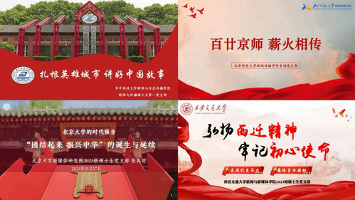 华中科技大学新闻与信息传播学院新闻与传播硕士生第一党支部组织委员王梓晗同学讲述了抗击疫情期间华科校友、师生的逆行与冲锋,使命与担当,并倡导在座新传专业的同学们讲好中国故事、弘扬伟大精神。北京师范大学成人网 专硕党支部书记寸婧同学介绍了北师大的百年发展历程如何见证了中国的百年激荡,从“四有”好老师、等方面讲述了北师大积极参与国家教育改革与发展的师道风貌。北京大学新媒体研究院2023级硕士生党支部书记张冉玥同学为大家分享了“团结起来,振兴中华”和“小平您好”两大历史红色口号与北京大学之间的联系,回顾了建国70周年庆典等新时代事迹,鼓励同学们涵育家国情怀,投身伟大时代。西安交通大学新闻与新媒体学院2023级硕士生党支部书记卢梦迪同学在讲述“向科学进军,建设大西北”的伟大西迁精神的基础上,介绍了新时代下交大人践行西迁精神的生动事迹,勉励大家弘扬西迁精神、牢记初心使命。
