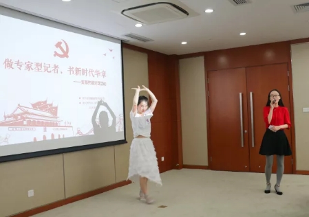 活动的第一个环节是才艺展示,两个支部的同志相继进行表演。首先,新华日报第四党支部的王建旸、华夏、王慧和杨频萍等四位同志上台朗诵《共产党宣言》的节选片段,声音铿锵,感情充沛。接着,2017级学硕党支部的万杰、钟鑫、张廿彧、田元等四位同学朗诵了诗歌《我的祖国》,赵一燊、潘培同学则带来歌舞表演《绒花》。几位同志的精彩表演获得了大家热烈的掌声。