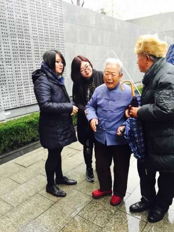 在参观过程中,党员们也遇到了一位特殊的老人,她满头银发,脚步蹒跚。据了解,这位老人80年前居住在南京浦口附近,亲眼目睹了日军将村里人一车一车运走,当日本人踏入她家时迎面就把她爷爷当场刺死。今天她冒雨前来在石碑上找到了爷爷的名字,悲痛不已。这一幕触动了在场所有人的心。当曾经的幼童变得垂垂老矣,苦痛却未曾从心头抹去。