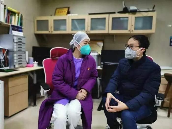 程远州(右)在武汉大学中南医院采访。
