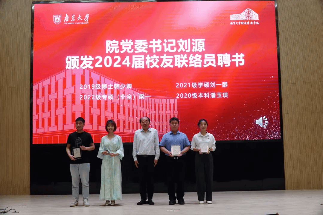 为进一步做好校友工作,学院从2024届毕业生中选聘4位校友联络员,院党委书记刘源为他们颁发校友联络员聘书。