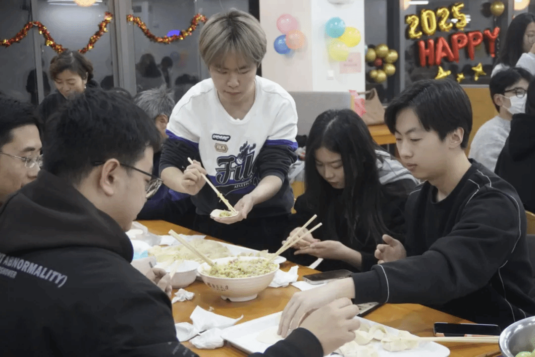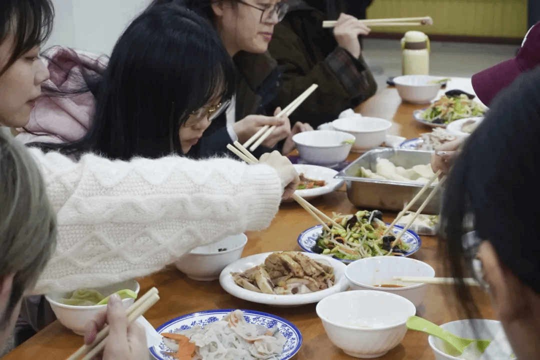 热气腾腾的饺子很快出锅,配上拍黄瓜、口水鸡等凉菜,“冬至晚宴”正式开始!大家围坐成几圈,开始享用自己的劳动成果。