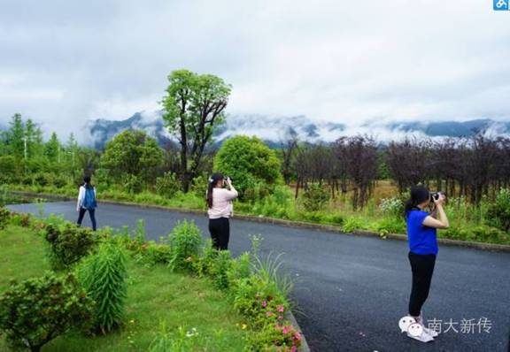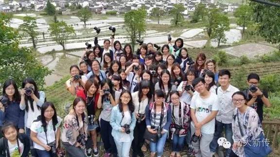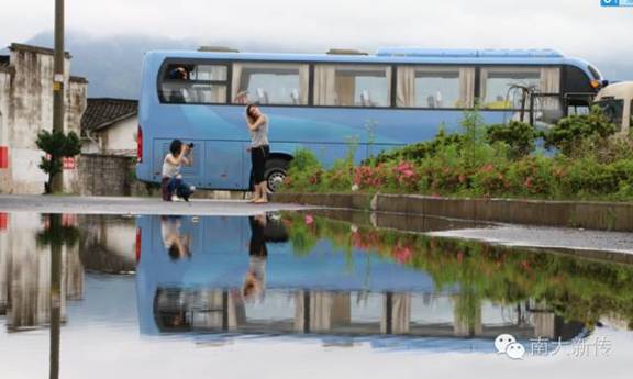大二年级修读新闻摄影课程的同学们步履匆匆,冒雨前行。他们要在逸夫楼前乘车赶往皖南——此次课程实习地。