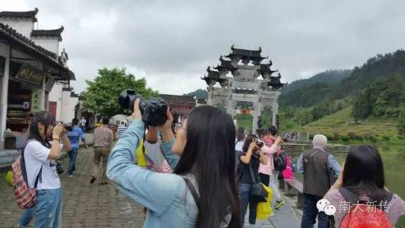 不过,很快大家便发现夕照余光下的宏村是值得空腹而游的。雨后初霁,从检票口步行约几十步后便来到了村口南湖。弓形的南湖湖面倒影浮光,水天一色,远峰近宅,错落有致。同学们纷纷举起相机,咔嚓声四起,南湖很快被同学们“包围”了。