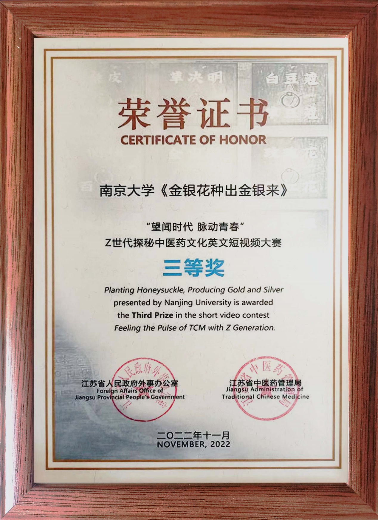 《金银花种出金银来》、南京理工大学《古法艾灸:你不知道的中医疗虚秘方》、南京师范大学《咖啡遇上茶》、南京中医药大学《金线莲2.0》获三等奖。获奖作品在江苏中医药国际交流大会上进行了颁奖,并在新华社海外平台上线首发,充分展示了在现代语境下青年群体对中医药的理解与认知,助推中医药文化国际交流推广。