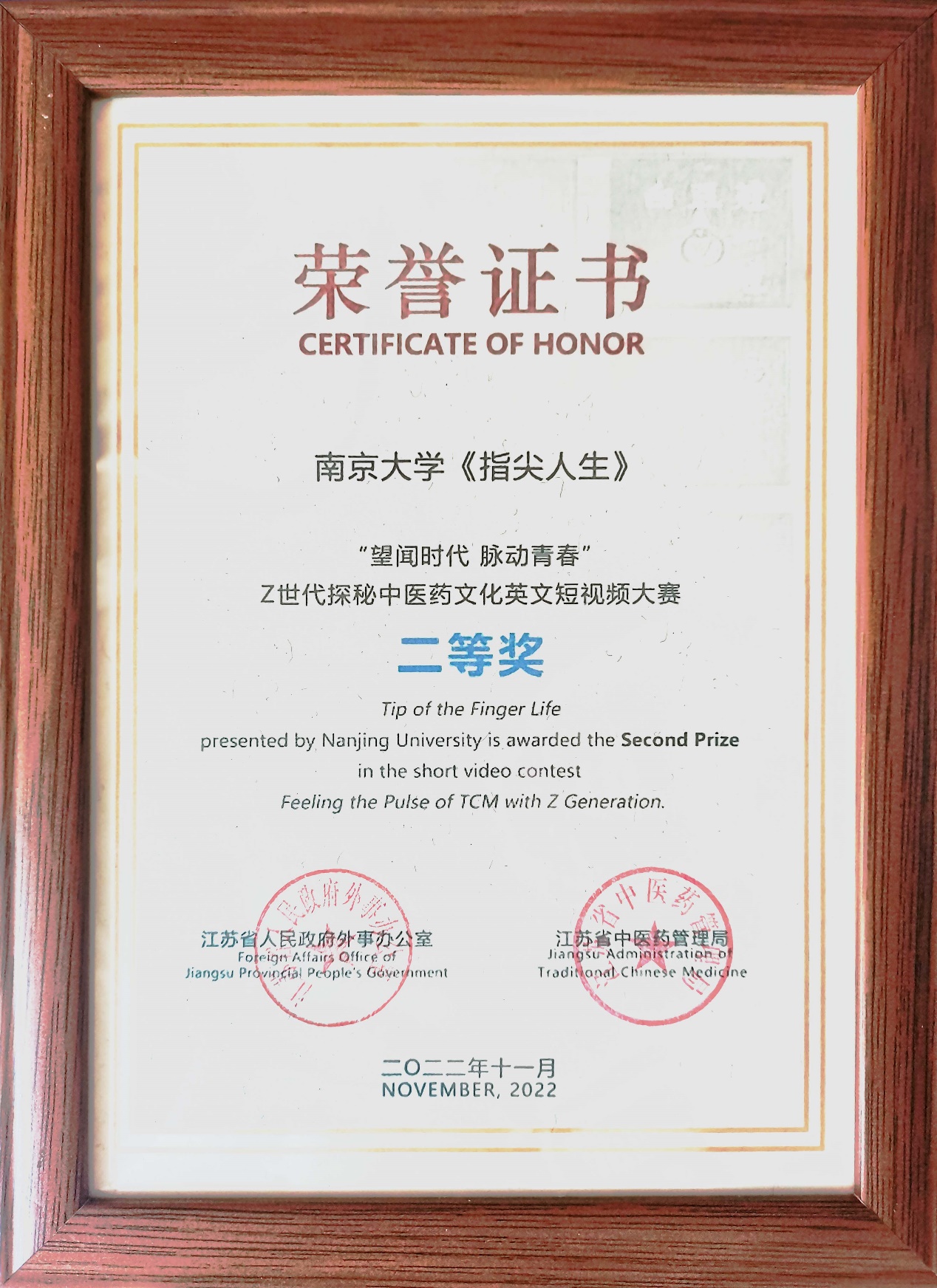 学生创作的《指尖人生》获得二等奖。该组学生前往南京市盲人学校和盲人按摩院,采访学习按摩的学生、从事按摩教学的老师,以及在按摩院就业的视障员工,反映学习传统中医按摩,为视障群体带来的就业机会,以及社会各界对视障群体的支持。