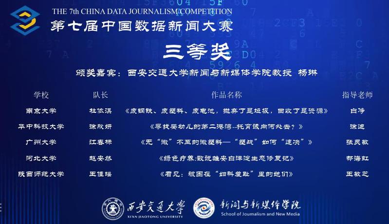 11月26日,第七届中国数据新闻大赛公布比赛结果,成人网 杜依淇、朱珂影、伍甜甜三位同学的数据作品《废钢铁、废塑料、废电池,抛弃了是垃圾,回收了是资源》荣获三等奖,白净老师荣获优秀指导老师奖。