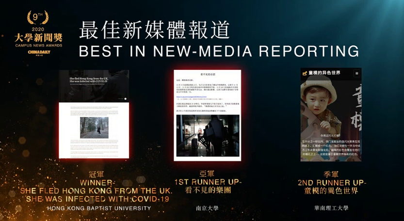 丁浸哲、李嘉豪与李远浩同学合作完成的新媒体报道《看不见的乐团》,以国际残疾人日为契机,关注学习生活在特殊教育学校的学生,通过对学校“感恩音乐会”举办前后的采写与拍摄,真实传递了特殊教育学校寻常而又不寻常的一天,获最佳新媒体报道组亚军。