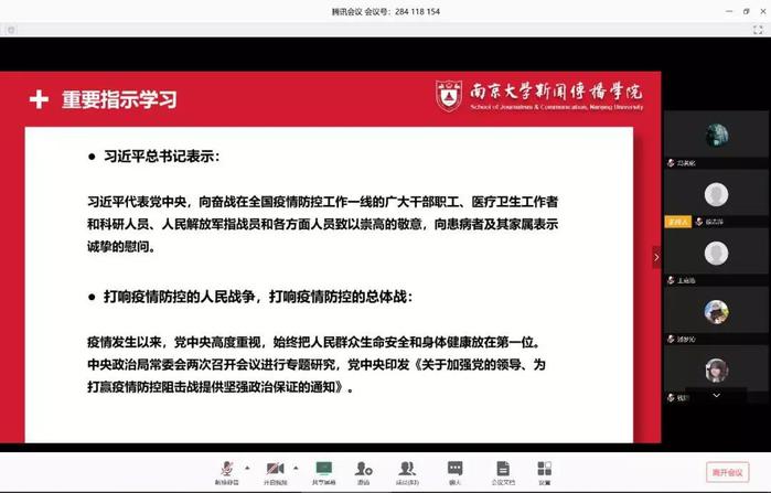 同时,学院积极开展线上党团活动与班会活动,贯彻落实以习近平同志为核心的党中央对于抗击疫情的重要指示,践行学校关于疫情防控的相关部署,教育引导新传学子理性看待疫情、坚定信心决心、强化责任担当。