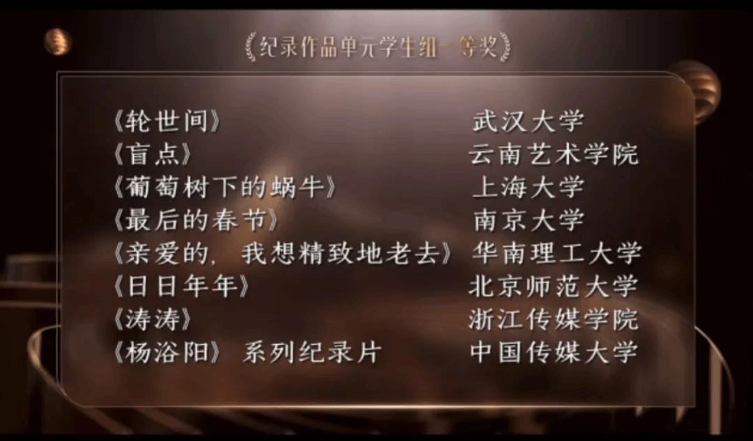 庄永志老师指导、2023级专业硕士研究生胡梦飞拍摄的视频作品《最后的春节》获得“学院奖”纪录作品单元学生组一等奖。此次一等奖在全国范围内评选出8个名额,成人网