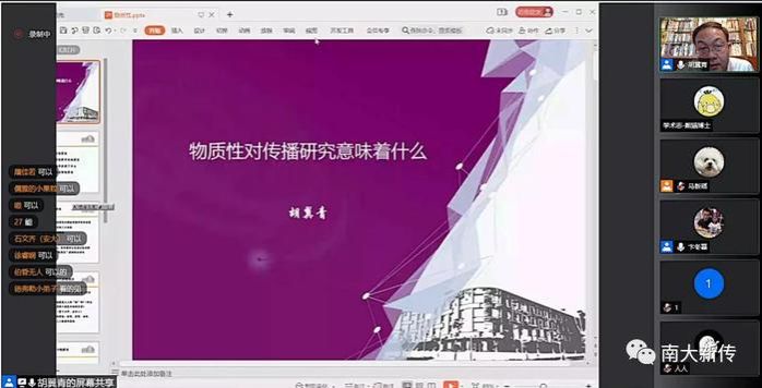 胡翼青教授带来题为《物质性对传播研究意味着什么》的讲座。胡翼青教授为我们一一介绍了物质性的概念及其三大传统:西方马克思主义的空间转向、海德格尔的物向本体论 、法国结构主义理论的新物质主义,在此基础上,胡教授进一步剖析了传播学视野中的物质性,为大家理解和把握媒介物质性提供了很多指导。