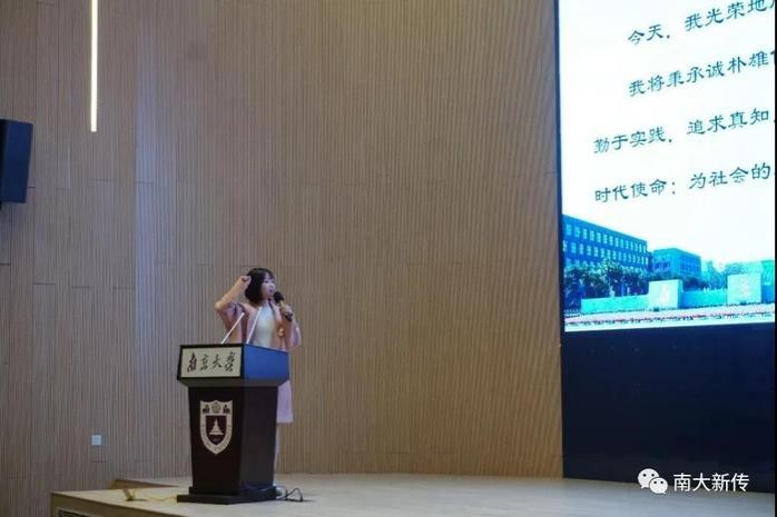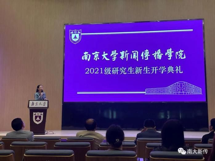 21级学硕陈丽敏作为新生代表进行了发言。相比于一些同学来说,她是一名老生,因为她已经在这里度过了本科时光,但她更是一名新生,对研究生的学习生活既紧张、又期待。她说,南大新传容得下真相和真理,更容得下情怀与理想,期待未来能与大家携手并进,探索无边无际的学术海洋、捍卫新闻传播的事业与价值,在更大的舞台上发出我们的声音。